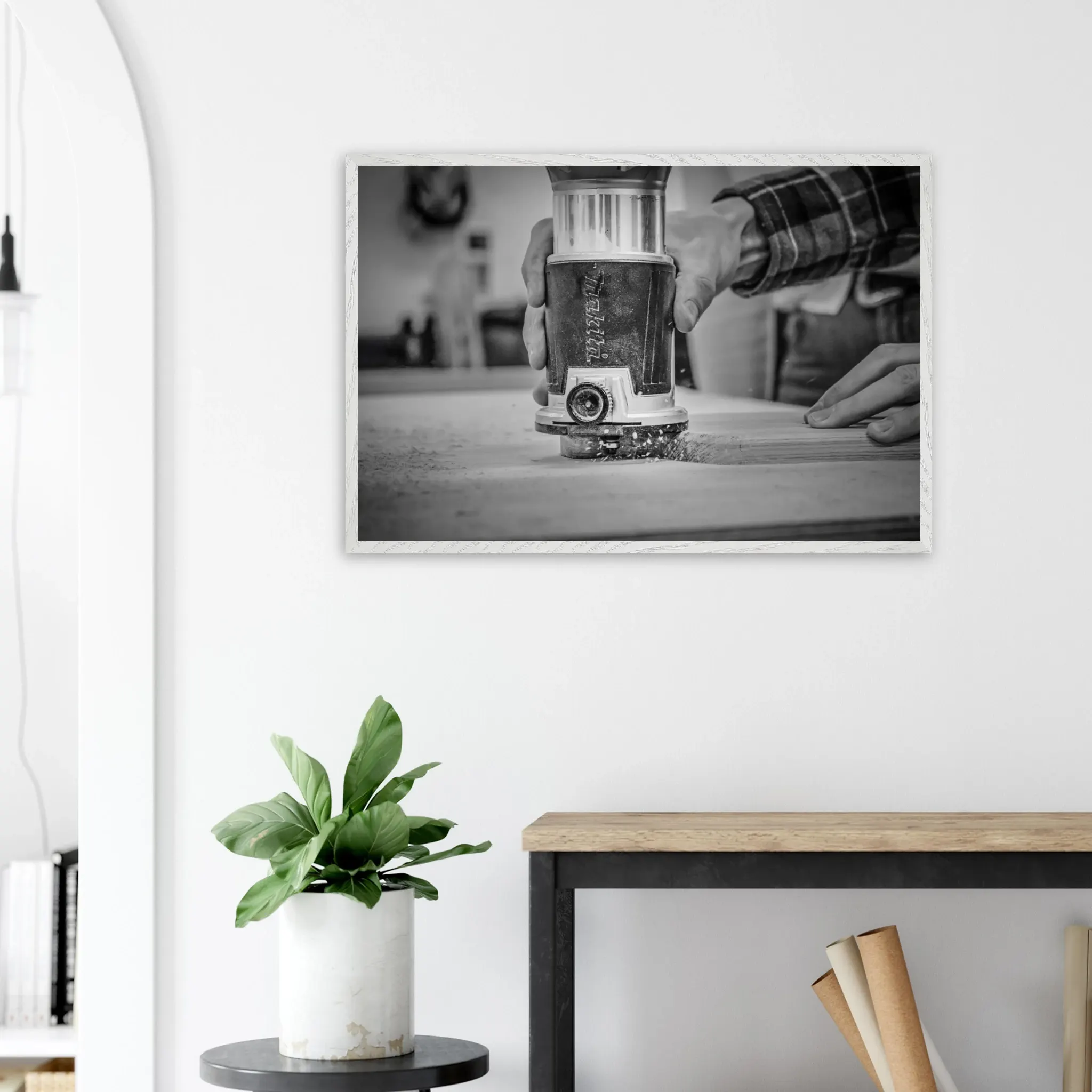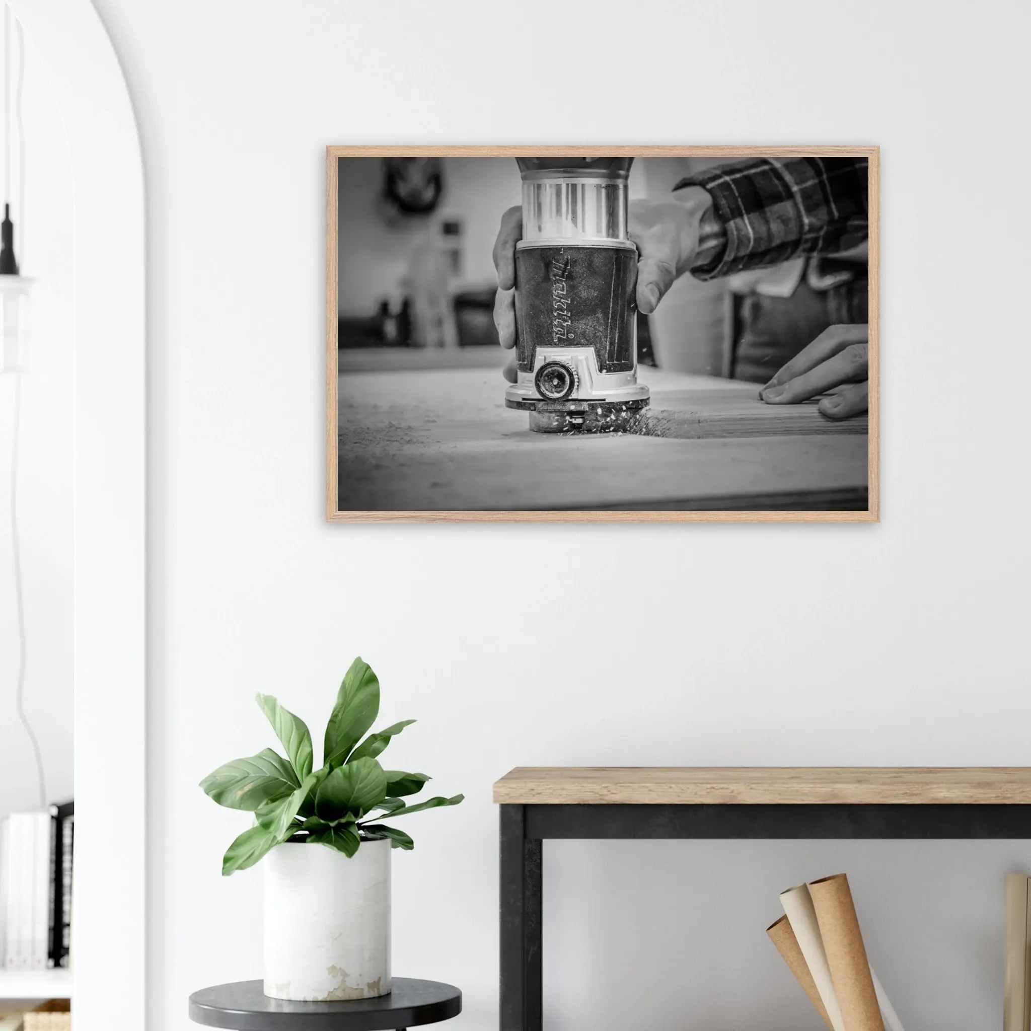 - Plongez dans « L’atelier de l’ébéniste », un tirage photo d’art en noir et blanc capturant avec force les mains d’un artisan à l’œuvre. Tout d’abord, la scène met en lumière le geste précis et concentré de l’ébéniste, en train de façonner une planche à découper en bois massif. Ensuite, les copeaux qui s’envolent autour de lui ajoutent une dynamique visuelle forte, révélant la matière vivante du bois et l’énergie du travail manuel. De plus, ce tirage en édition limitée célèbre l’élégance brute de l’artisanat français et la noblesse du bois français. En outre, le noir et blanc renforce l’intemporalité de l’image, parfaite pour une décoration authentique et empreinte d’un caractère particulier. Enfin, cette œuvre raconte un moment de création, entre précision, passion et respect des savoir-faire et de la matière.